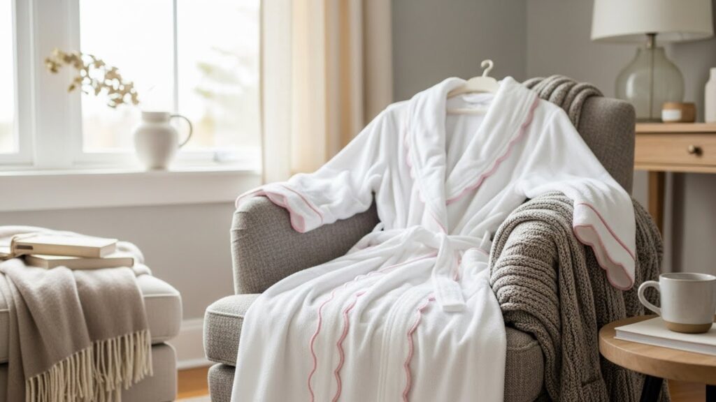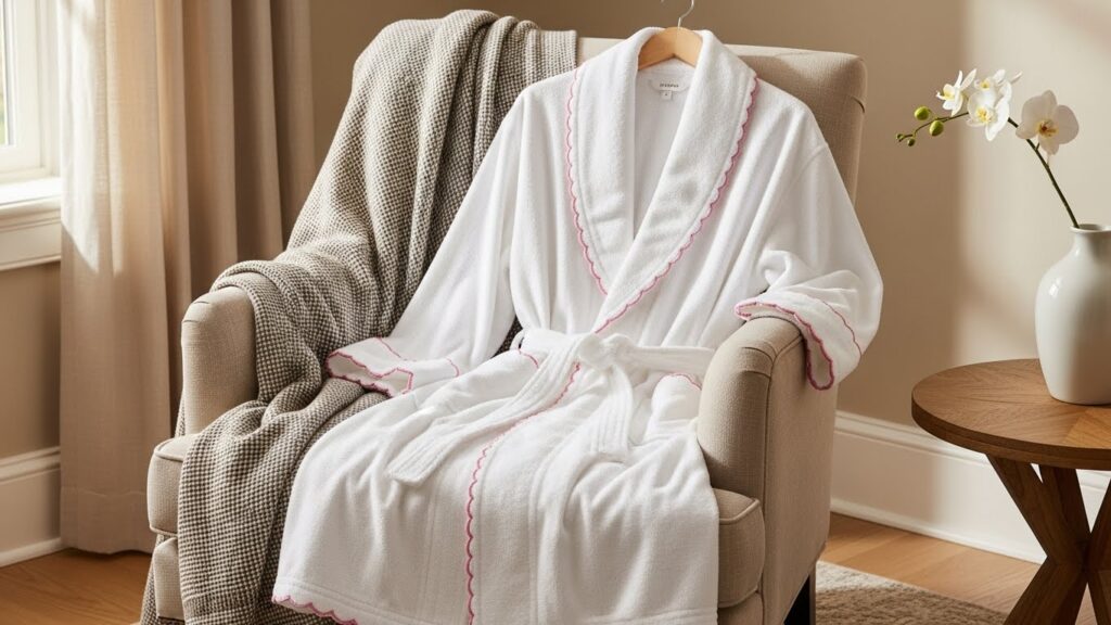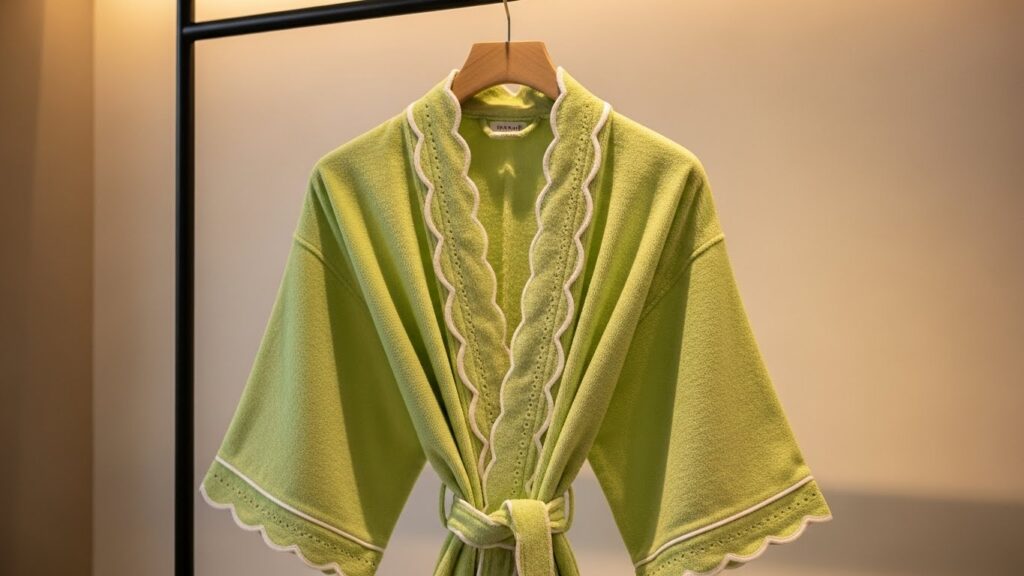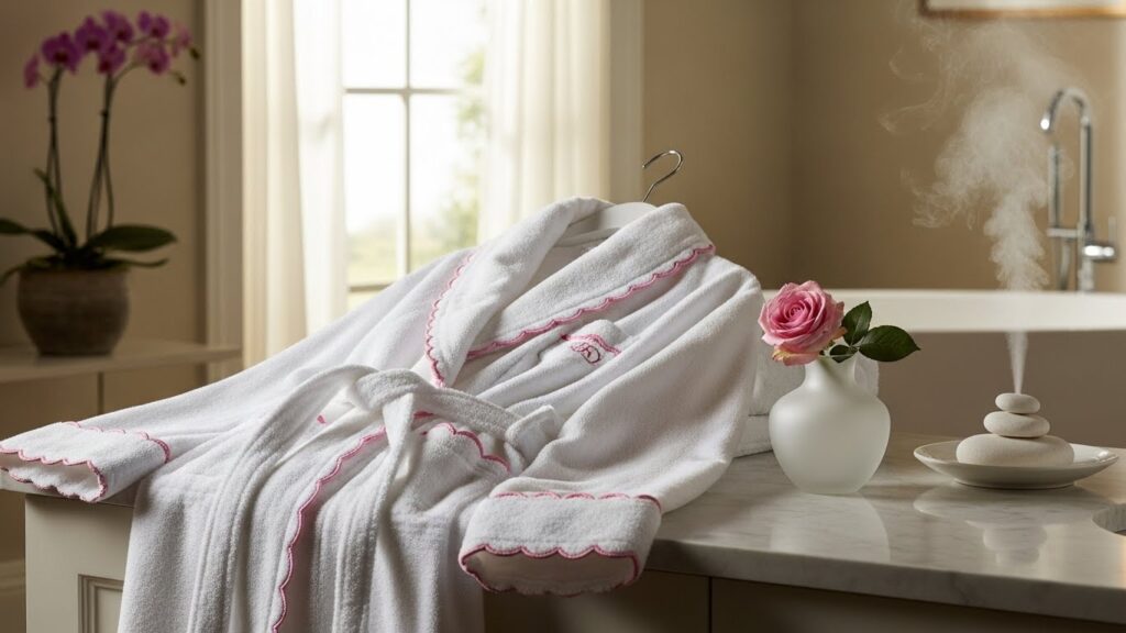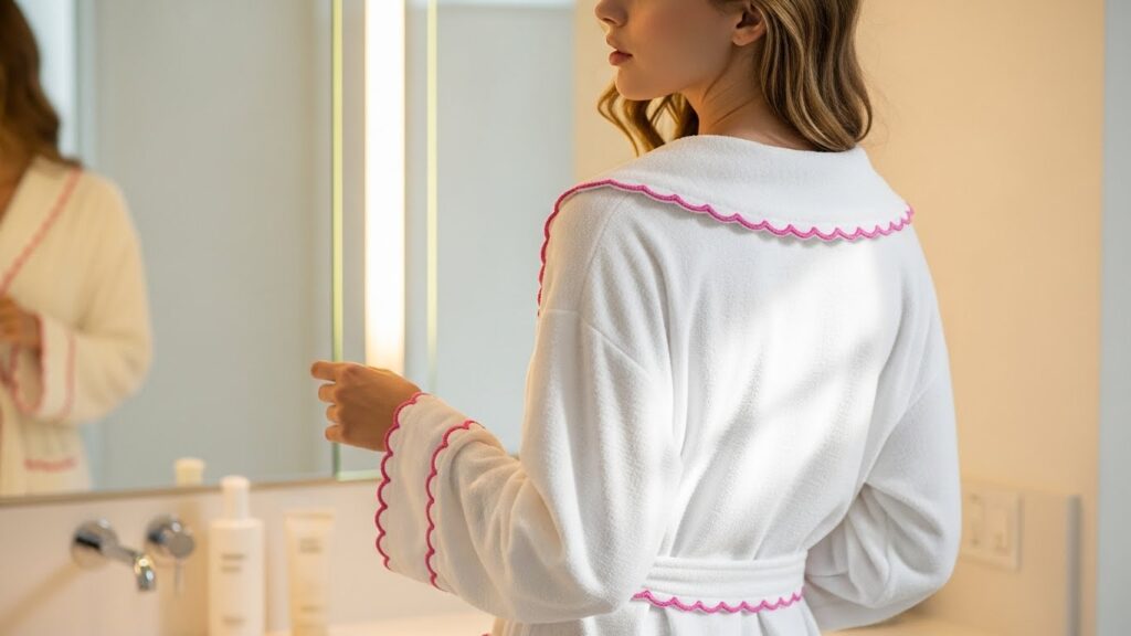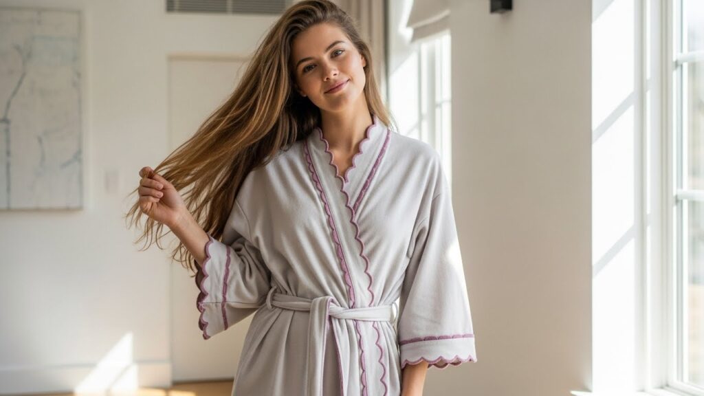 The Timeless Scalloped Bathrobe with Delicate Pink Trim is designed to remain stylish and comforting for years to come. Its timeless appeal lies in its classic silhouette, soft color palette, and elegant detailing. This bathrobe avoids trends, focusing instead on enduring design elements that feel familiar, comforting, and always appropriate.