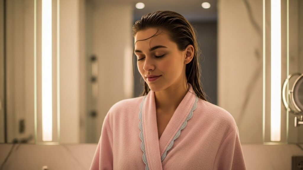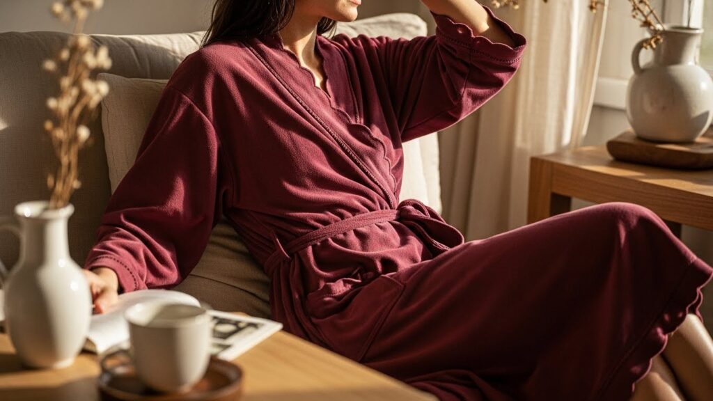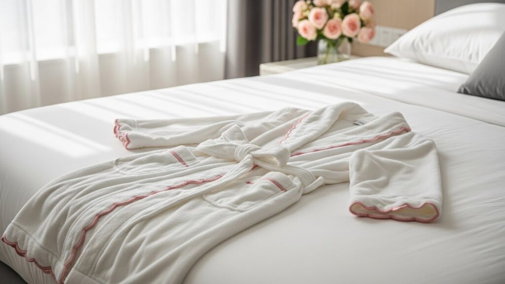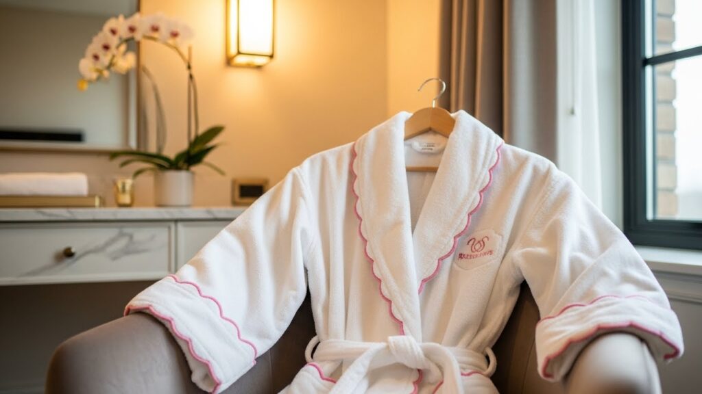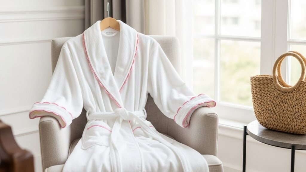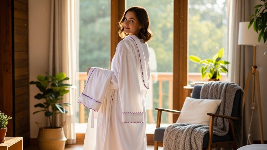 The Timeless Scalloped Bathrobe with Delicate Pink Trim is designed to remain stylish and comforting for years to come. Its timeless appeal lies in its classic silhouette, soft color palette, and elegant detailing. This bathrobe avoids trends, focusing instead on enduring design elements that feel familiar, comforting, and always appropriate.
