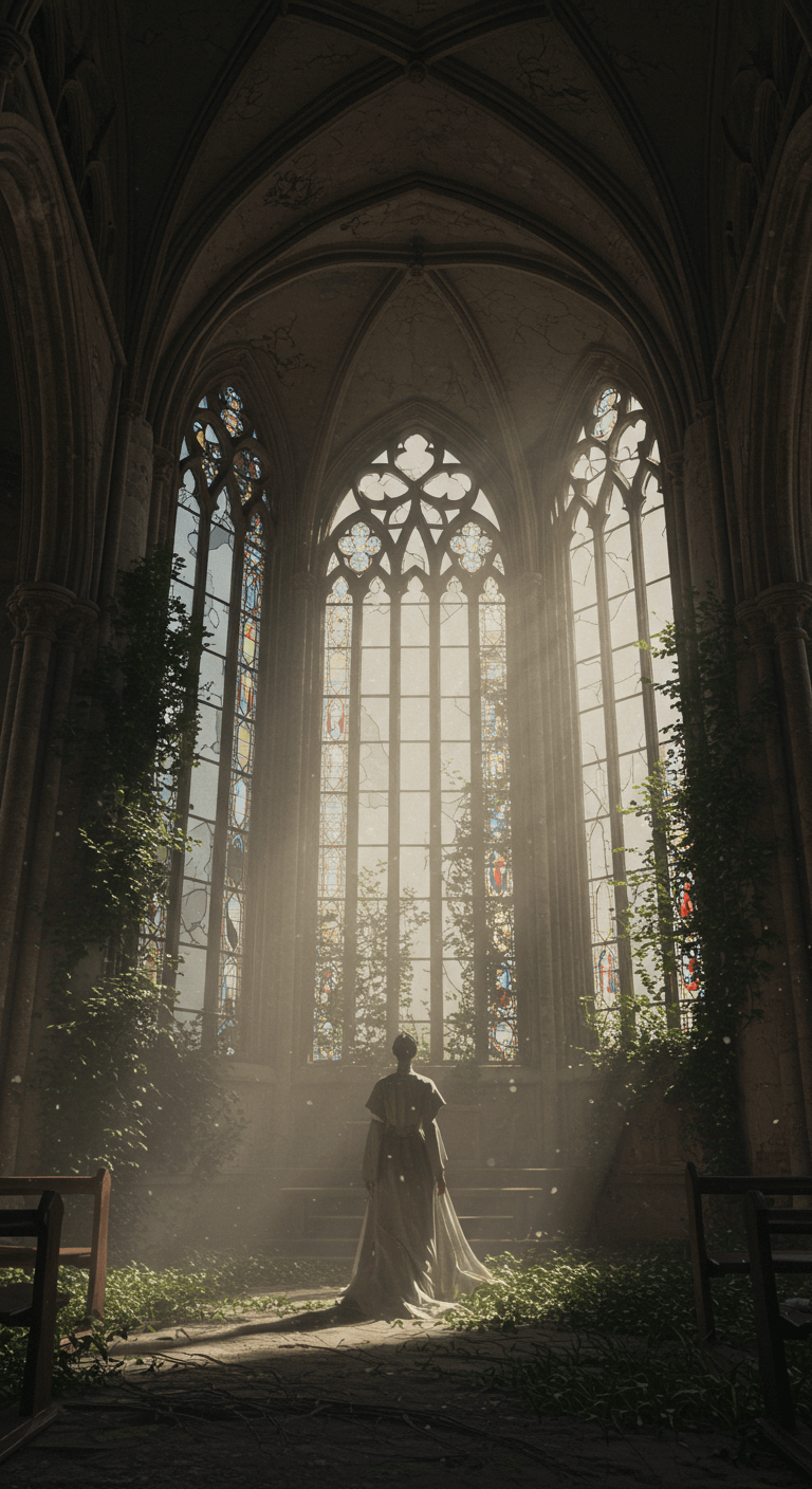 Sunlight filters through broken glass, casting shadows on forgotten furniture.